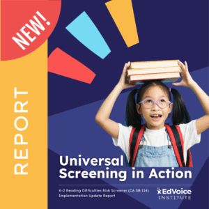 Legislation passed in 2023 (SB 114) is now rolling out to California classrooms, meaning 1.2 million K-2 students will be screened for reading difficulties, including risk of dyslexia, for the first time in the state’s history. This is a major milestone in the new policy’s implementation. As such, EdVoice Institute has released a report on school adoption of state-approved screener tools and future implementation considerations.